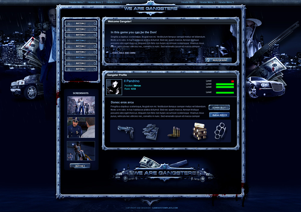 This is a Photoshop template themed for modern gangsters websites and games. This template comes with a wide range of layers and splash/login page design.
